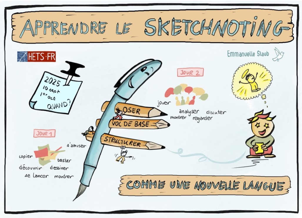 Je donne des formations sur deux jours, avec environ un mois d'intervalle. Ce dispositif permet aux participant·es de s'approprier le sketchnoting, de le tester dans leur pratique et de pouvoir renforcer l'apprentissage. Cette structure a fait ses preuve.